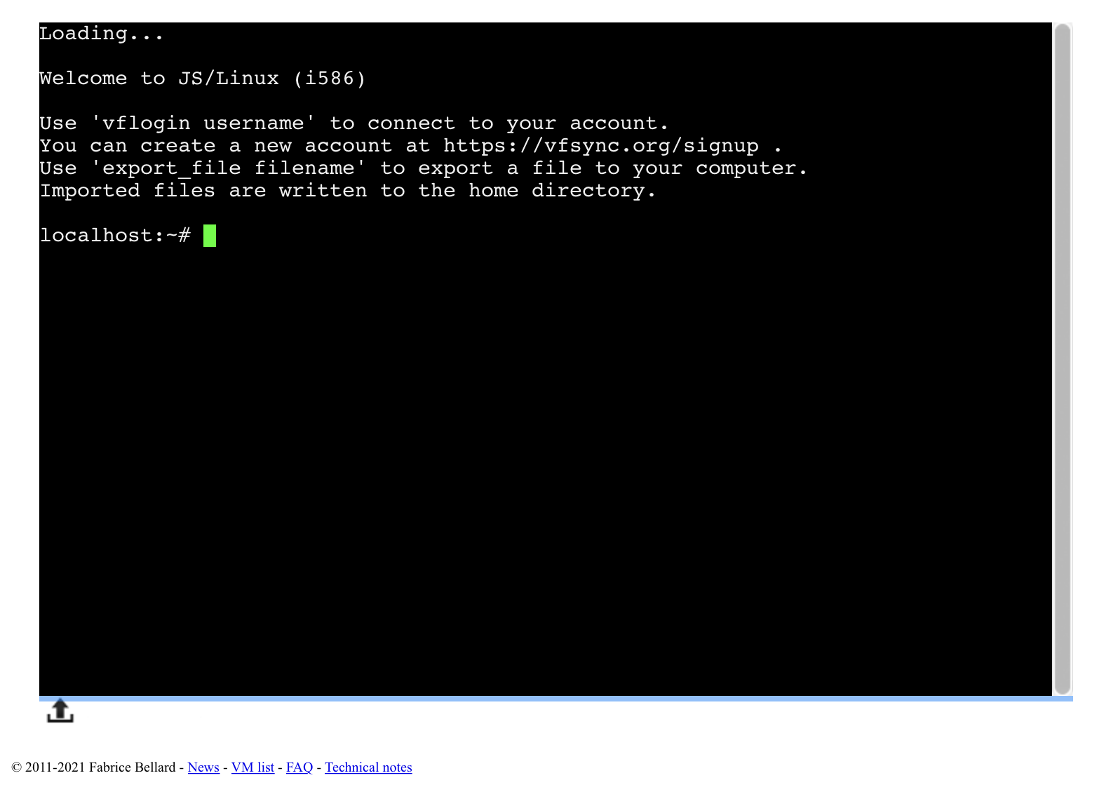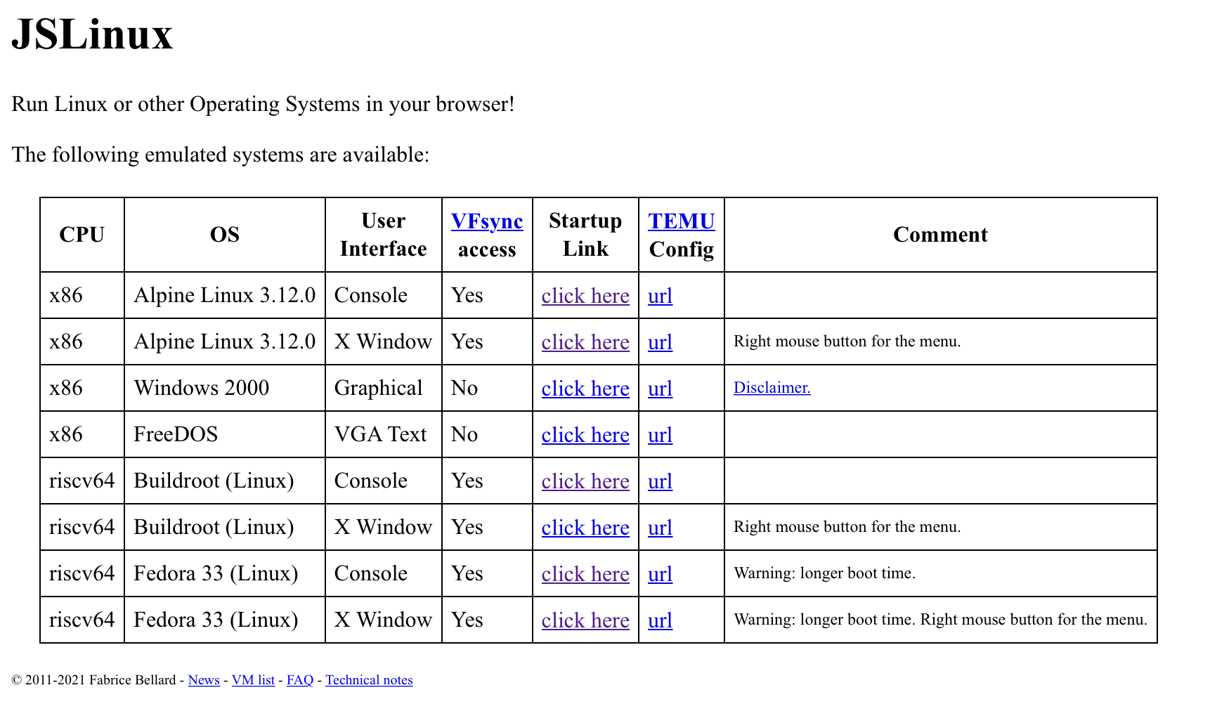JSLinux Run Linux or other Operating Systems in your browser! The following emulated systems are available: CPUOSUserInterfaceVFsyncaccessStartupLinkTEMUConfigComment x86Alpine Linux 3.12.0ConsoleYes click here url x86Alpine Linux 3.12.0X WindowYes click h
